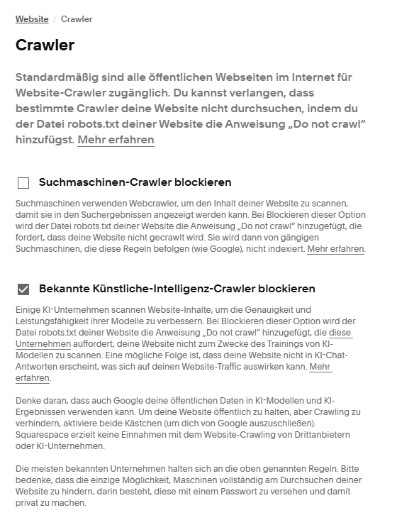 Geht in Einstellungen → Website → Crawler und wählt die gewünschten Optionen. Eine Checkbox schließt Suchmaschinen-Crawler aus, die andere blockiert KI-Crawler. Ihr habt damit folgende Optionen: